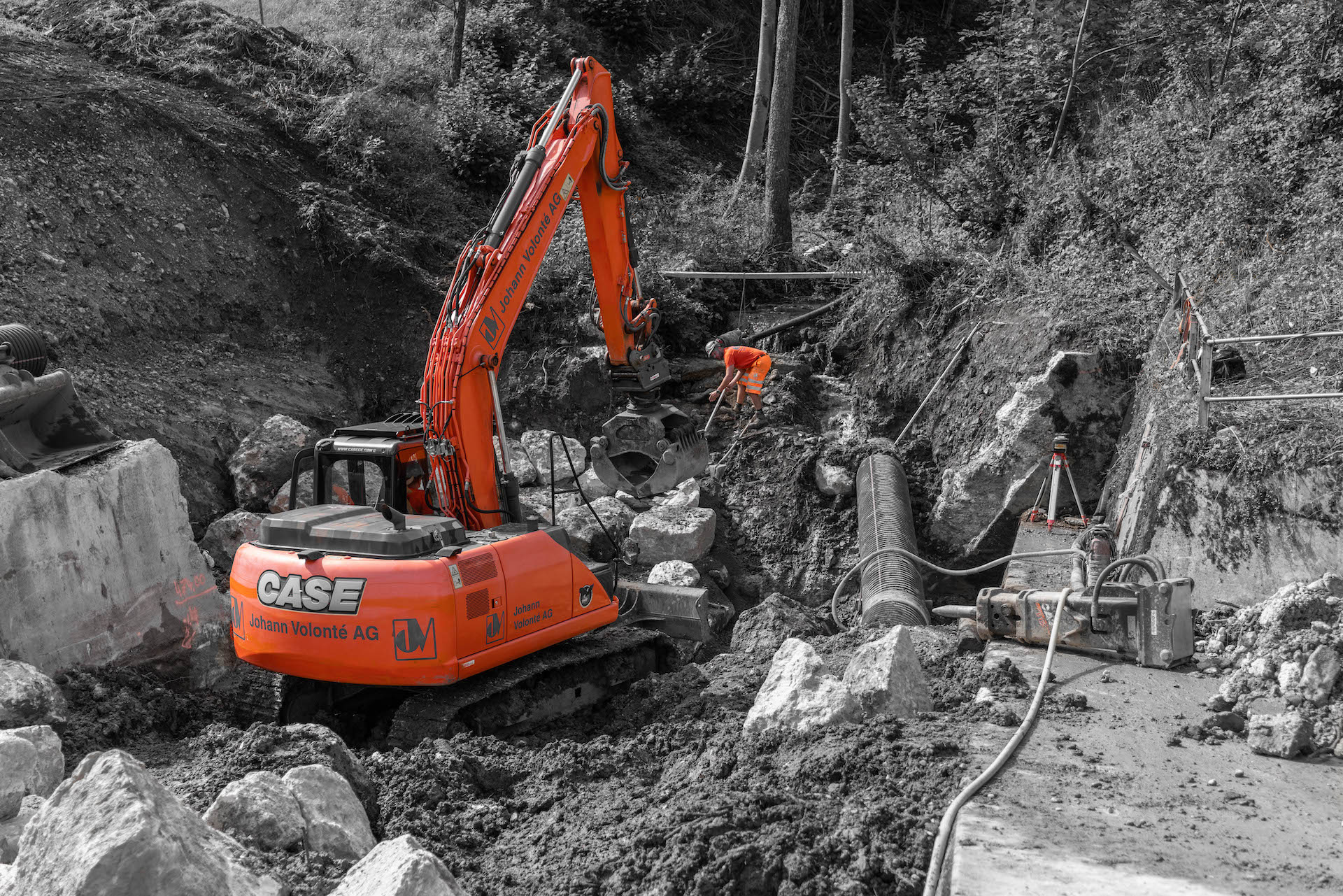 Der Geschiebesammler des Modlenbaches in Bärschwil kam gemäss kantonaler Zustandserfassung in die Jahre und muss saniert werden. Ein klarer Fall für die Johann Volonté AG, welche bereits an mehreren ähnlichen Bauwerken wie zum Beispiel in Meltingen (Kiesfang Grabenbach), Brislach (Melioration und Renaturierung mit Bauchausdohlungen), Nunningen (Hochwasserschutzmassnahmen Seichelbach), Bretzwil (Ausdohlung Nunningerbach), Zullwil (Renaturierung Gilgenbach), Blauen (Revitalisierung) etc. neue Massstäbe gesetzt hat.