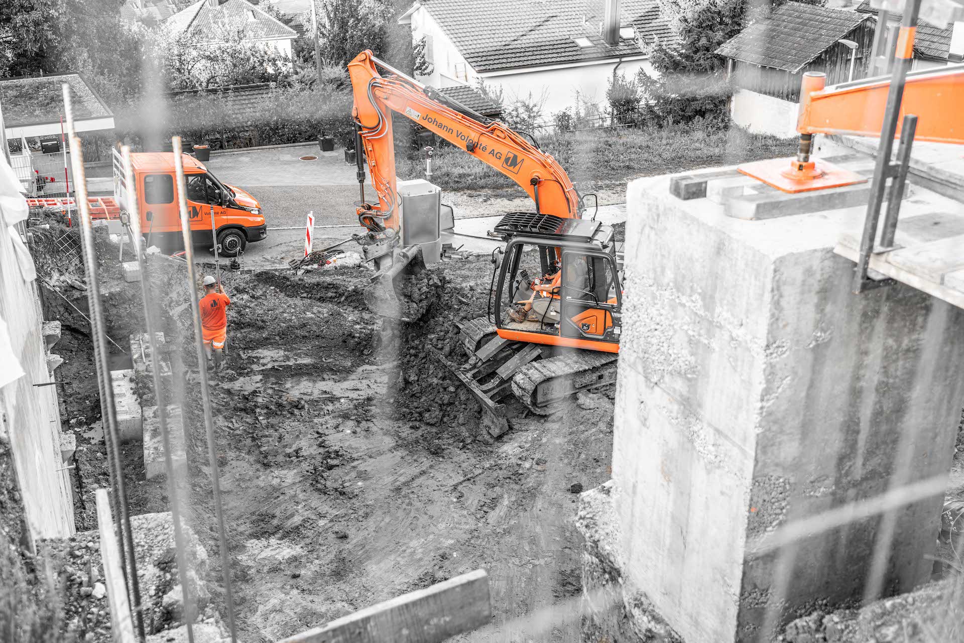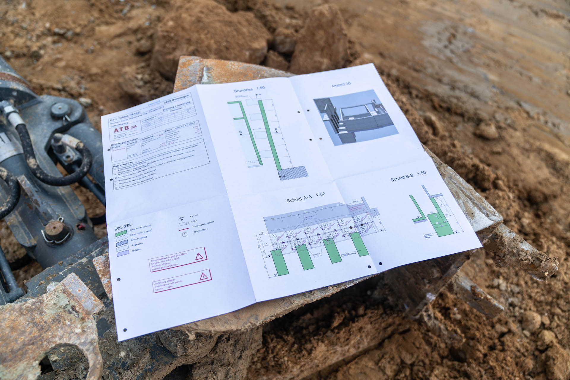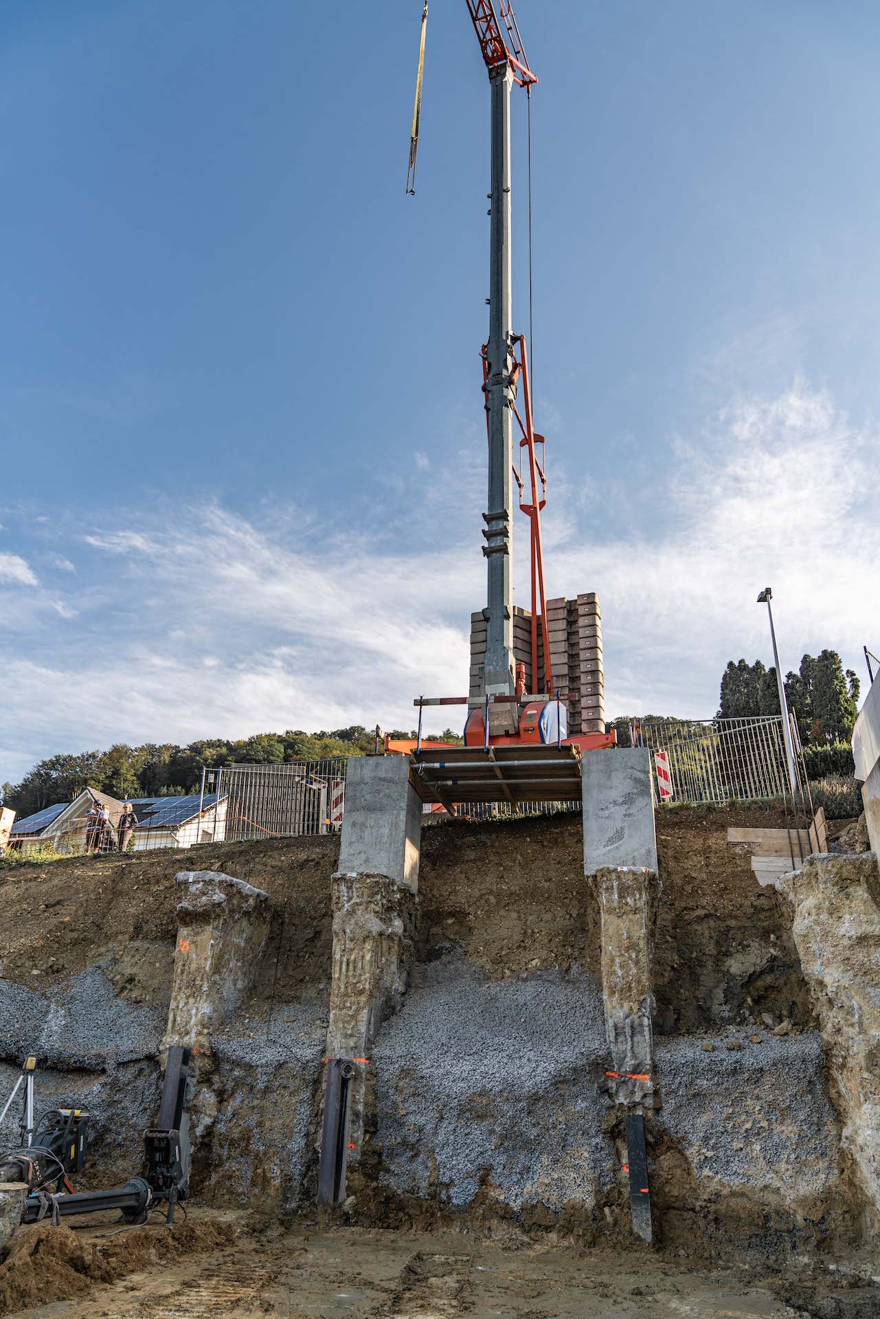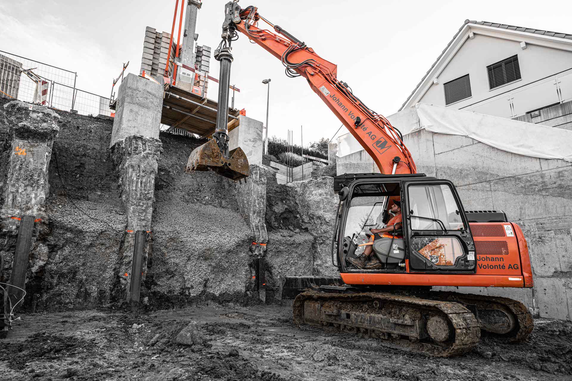 Mitten im Wohnquartier-Steilhang am Striffenweg in Nunningen wird durch die Volonté AG rund 1’000m³ Aushub abgetragen. Dies erfordert eine minutiöse Vorbereitung sowie Abklärungen mit Geologen der Kiefer & Studer AG in Reinach und Ingenieuren der ATB SA in Laufen. Die Baugrube wurde zuvor durch Bodenproben untersucht und später durch tiefgreifende Sporen und Vorsporen sowie mit Stahlträgern gesichert, damit die Nachbarshäuser und der Striffenweg standfest bleiben. Rund 7,5 Meter mussten gleich neben der Strasse für die Baugrube abgetragen werden. Die Mauer zum Nachbar wurde in mehreren Etappen fachmännisch unterfangen. Sie wanderte sozusagen mit in die Tiefe. Der Baukran wurde sicher auf den hohen Sporen montiert und hilft nun beim Aufbau des 3-stöckigen Hauses mit Garage mit.