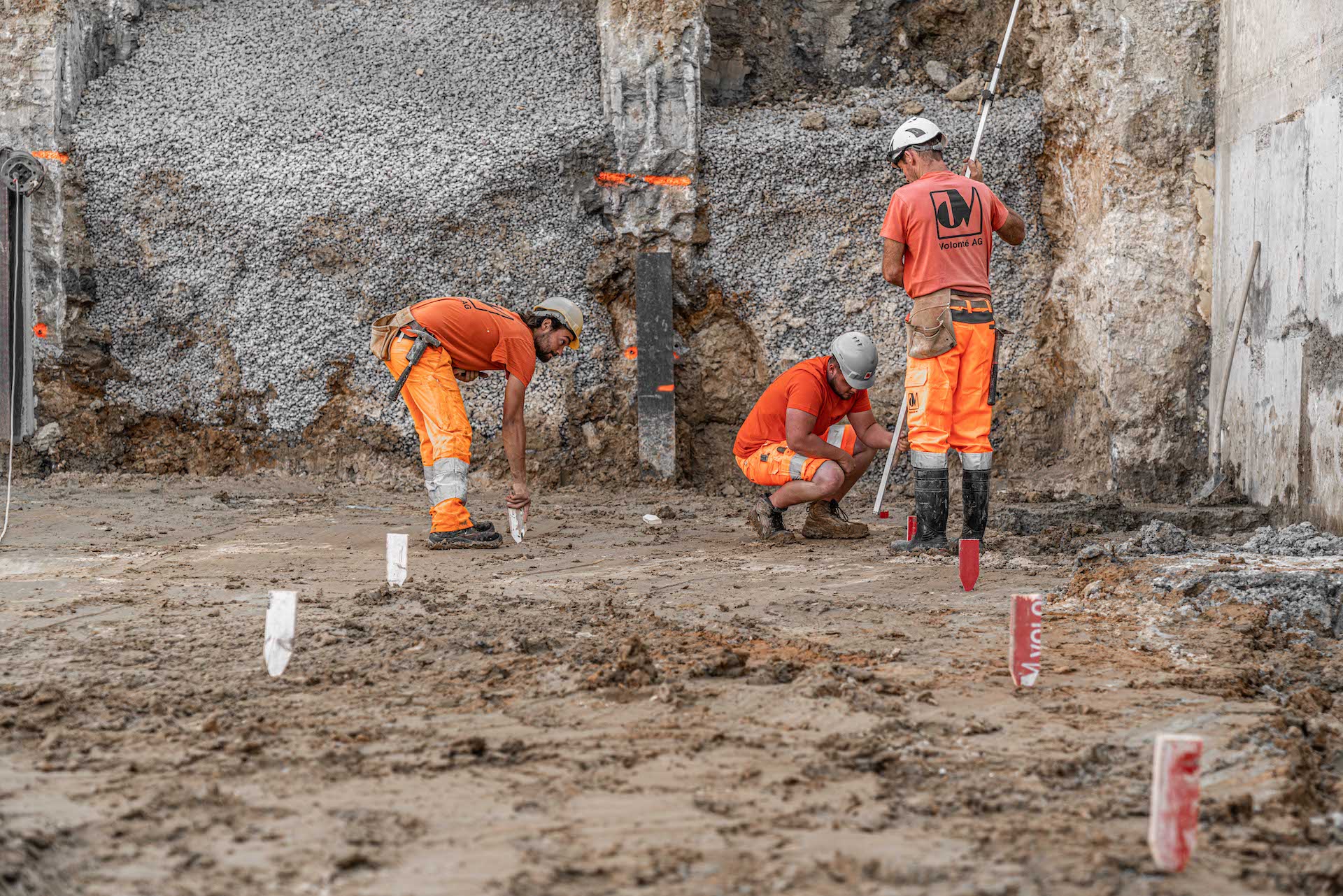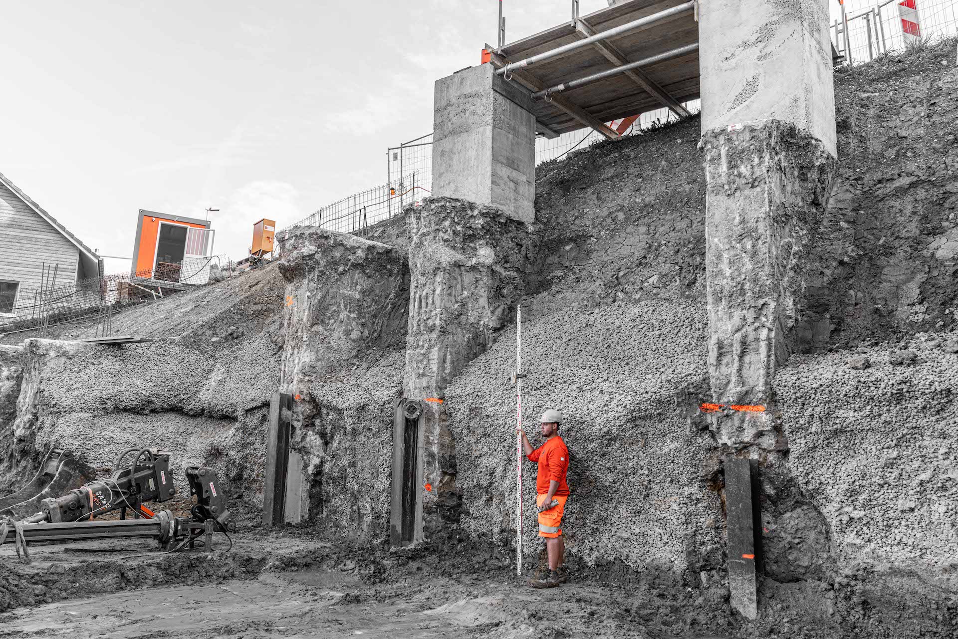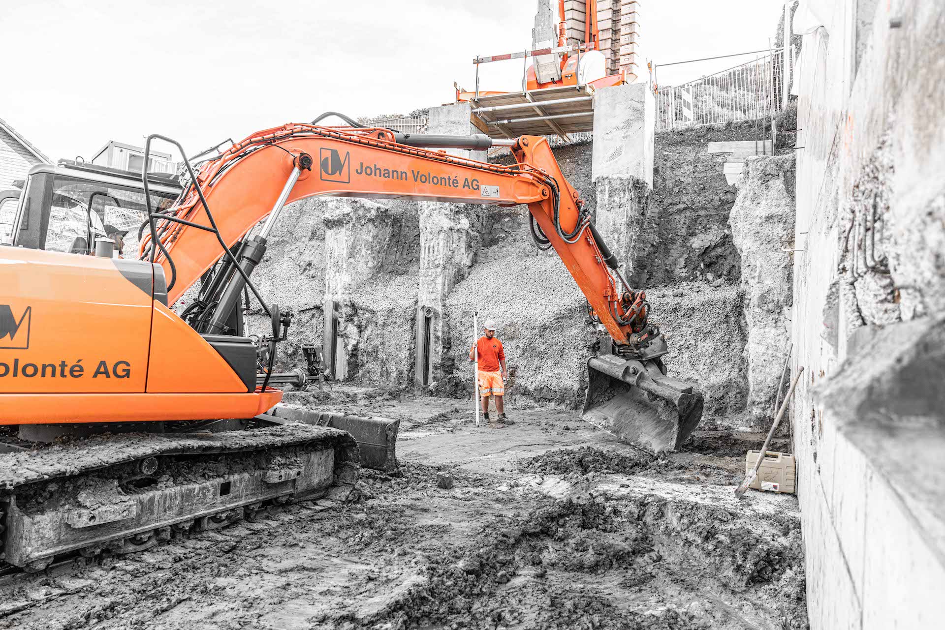 Mitten im Wohnquartier-Steilhang am Striffenweg in Nunningen wird durch die Volonté AG rund 1’000m³ Aushub abgetragen. Dies erfordert eine minutiöse Vorbereitung sowie Abklärungen mit Geologen der Kiefer & Studer AG in Reinach und Ingenieuren der ATB SA in Laufen. Die Baugrube wurde zuvor durch Bodenproben untersucht und später durch tiefgreifende Sporen und Vorsporen sowie mit Stahlträgern gesichert, damit die Nachbarshäuser und der Striffenweg standfest bleiben. Rund 7,5 Meter mussten gleich neben der Strasse für die Baugrube abgetragen werden. Die Mauer zum Nachbar wurde in mehreren Etappen fachmännisch unterfangen. Sie wanderte sozusagen mit in die Tiefe. Der Baukran wurde sicher auf den hohen Sporen montiert und hilft nun beim Aufbau des 3-stöckigen Hauses mit Garage mit.