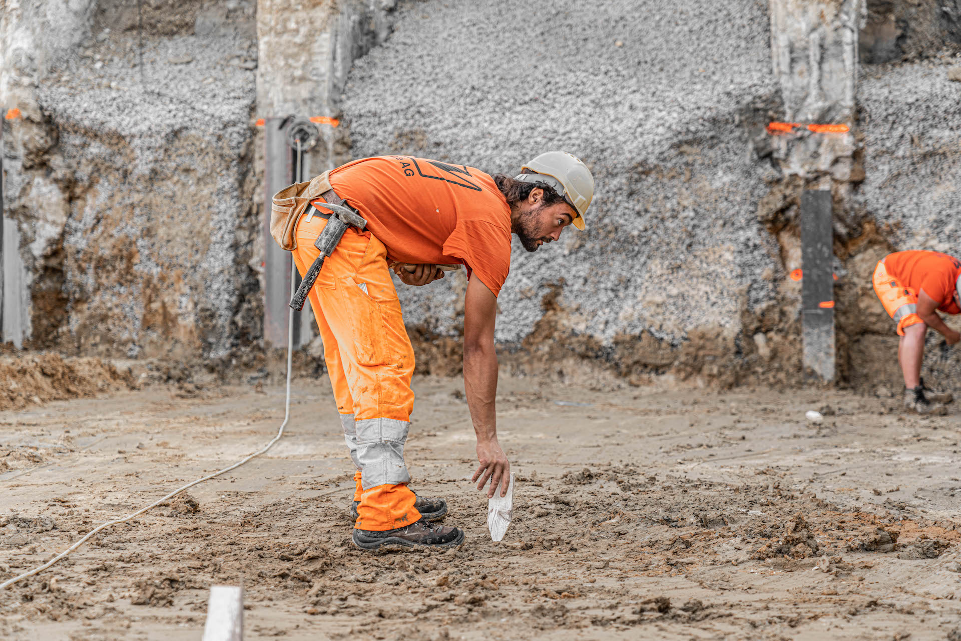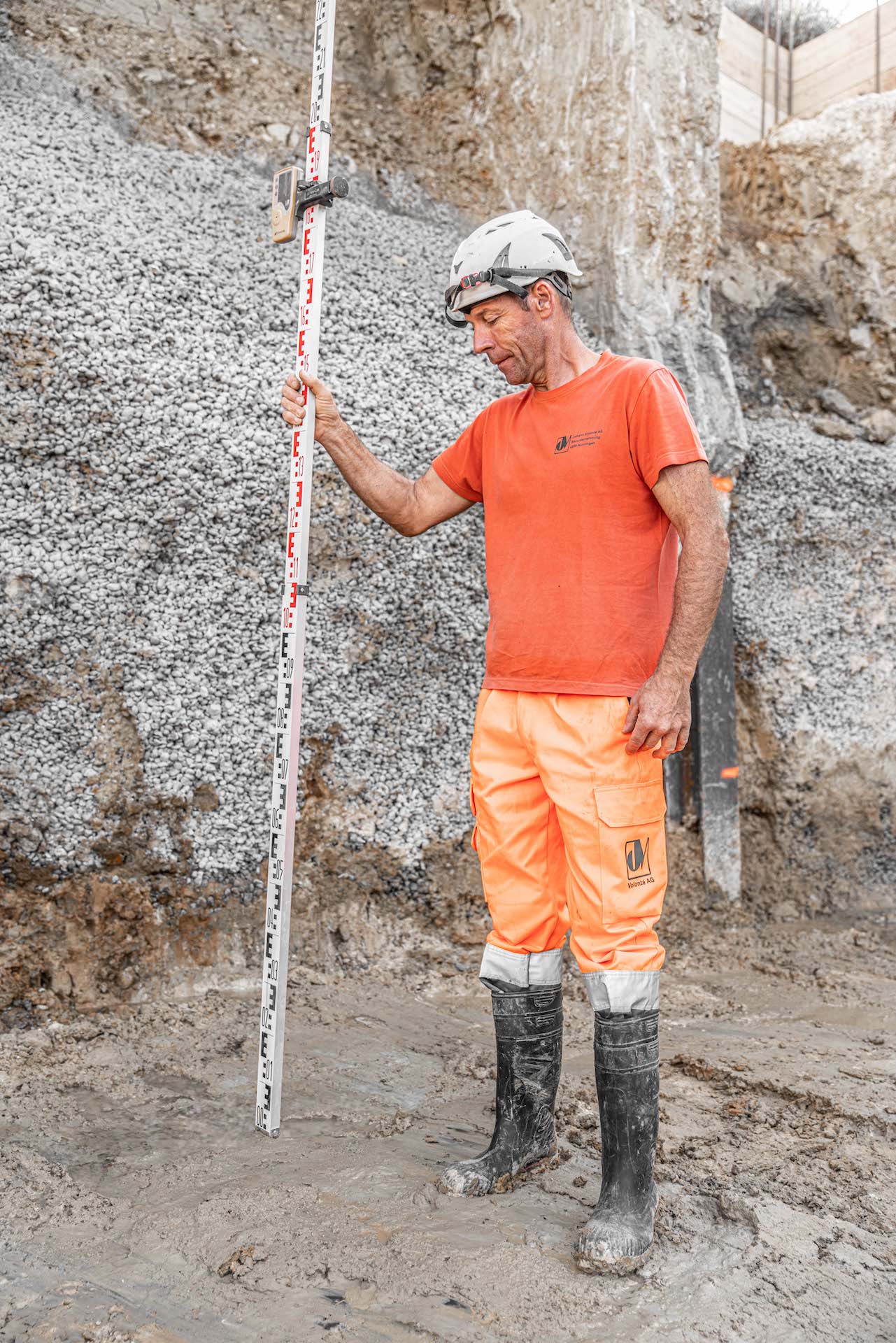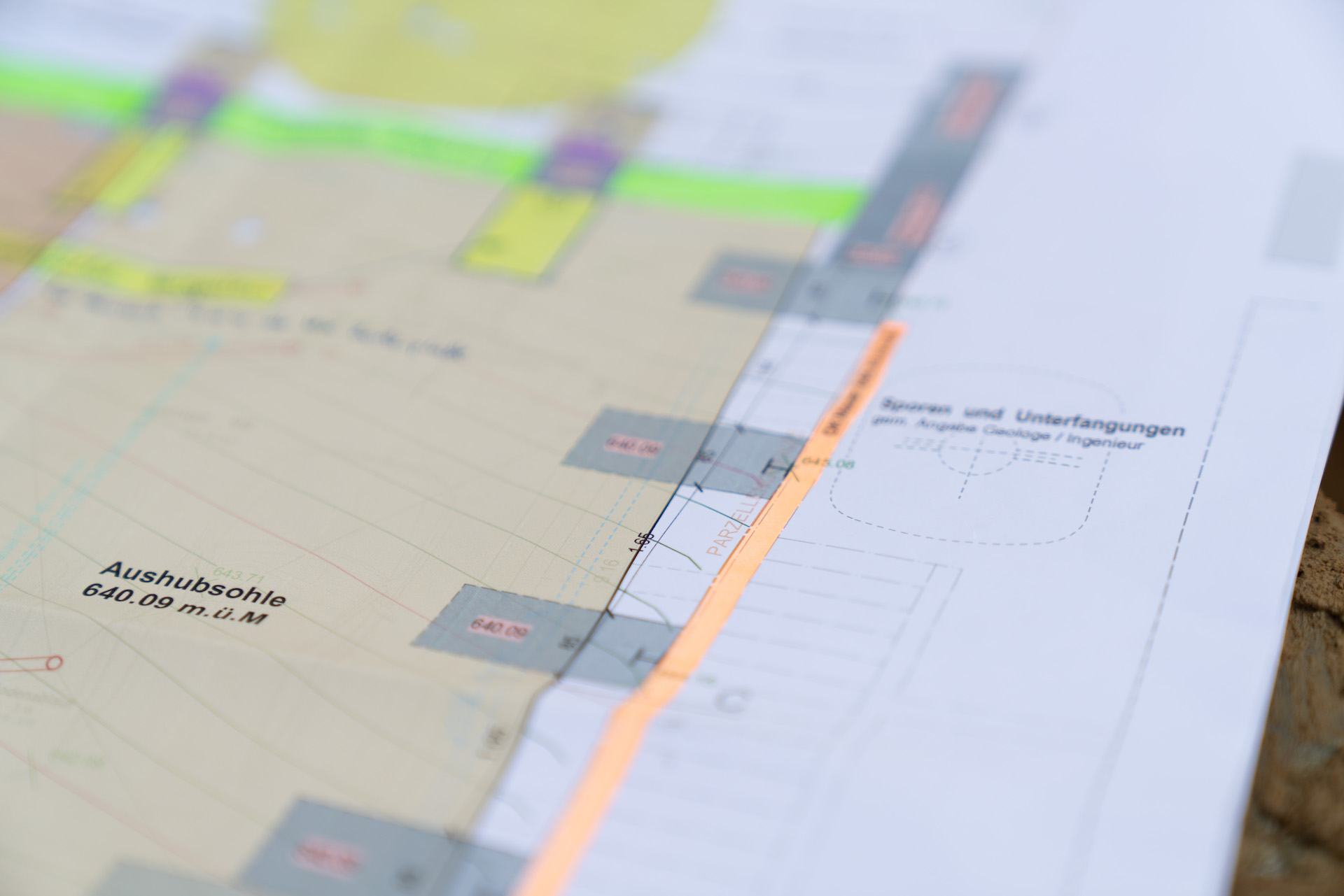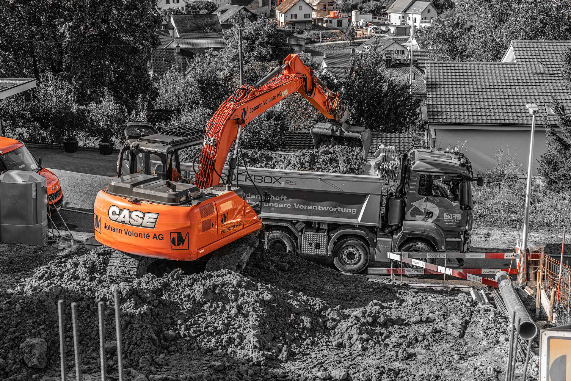Mitten im Wohnquartier-Steilhang am Striffenweg in Nunningen wird durch die Volonté AG rund 1’000m³ Aushub abgetragen. Dies erfordert eine minutiöse Vorbereitung sowie Abklärungen mit Geologen der Kiefer & Studer AG in Reinach und Ingenieuren der ATB SA in Laufen. Die Baugrube wurde zuvor durch Bodenproben untersucht und später durch tiefgreifende Sporen und Vorsporen sowie mit Stahlträgern gesichert, damit die Nachbarshäuser und der Striffenweg standfest bleiben. Rund 7,5 Meter mussten gleich neben der Strasse für die Baugrube abgetragen werden. Die Mauer zum Nachbar wurde in mehreren Etappen fachmännisch unterfangen. Sie wanderte sozusagen mit in die Tiefe. Der Baukran wurde sicher auf den hohen Sporen montiert und hilft nun beim Aufbau des 3-stöckigen Hauses mit Garage mit.