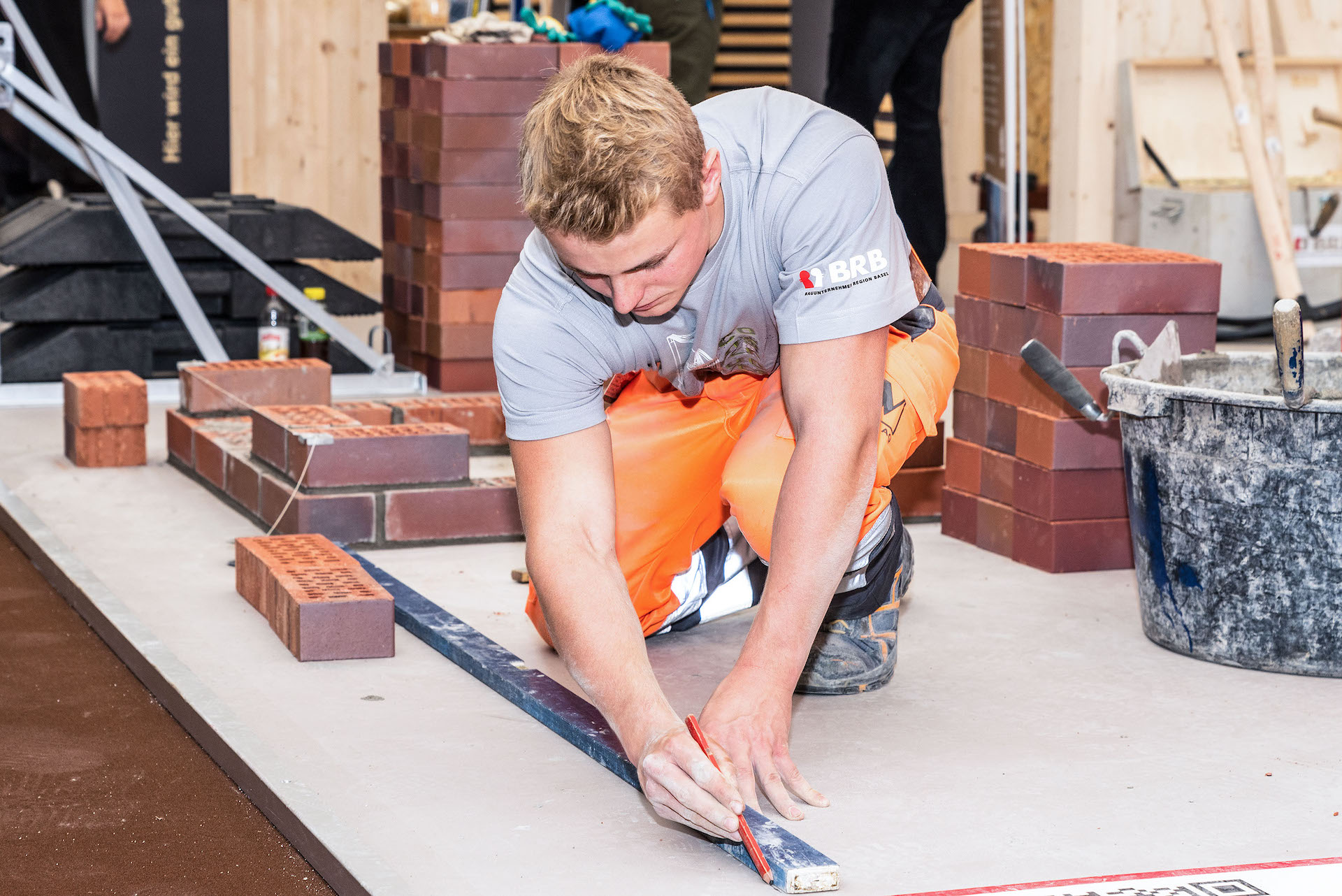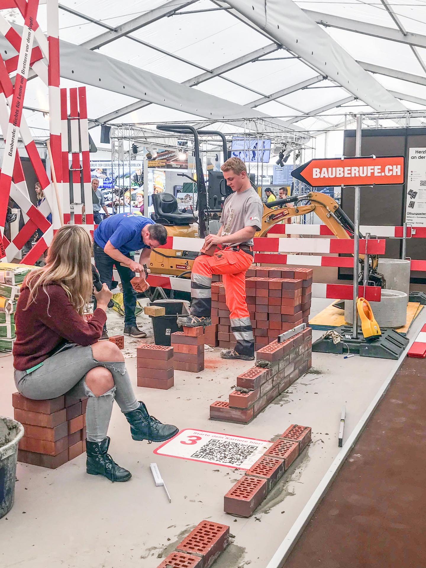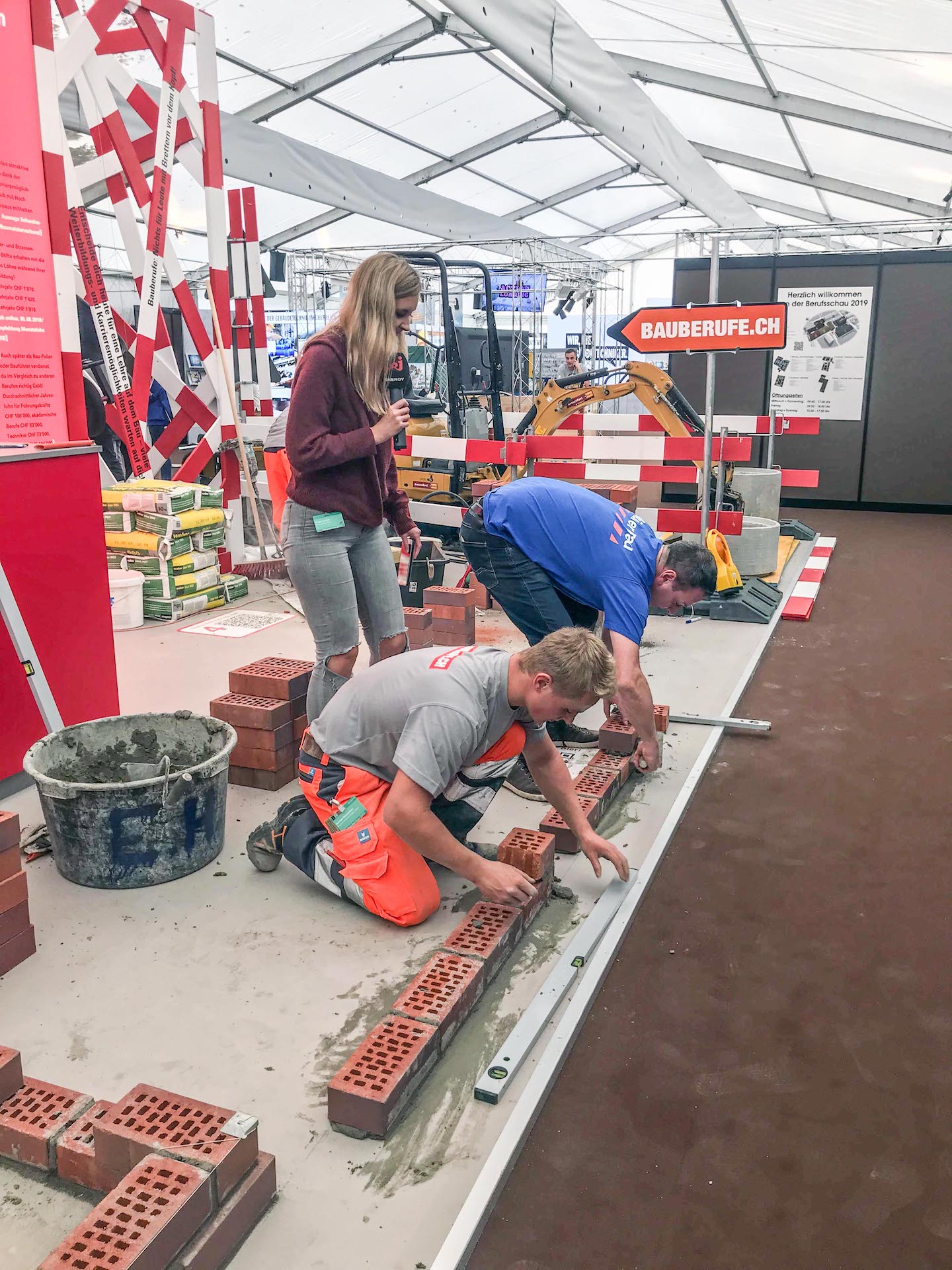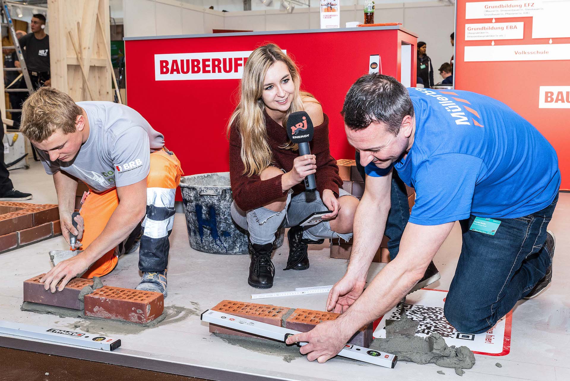 Unsere Lehrlinge Samuel Bachmann und Robin Jeger gaben an der diesjährigen Berufsmesse spannende Einblicke in die vielseitigen Arbeiten des Berufes Maurer/-in EFZ. Hansruedi Volonté war ebenfalls vor Ort und konnte die Fragen von den interessierten Besucherinnen und Besuchern mit seinem Fachwissen beantworten. Unter den Gästen war Daniel Studer vom Radio Energy Basel. Der Moderator, welcher ursprünglich seine Berufslehre zum Maurer absolvierte, hatte keine Fragen, sondern wollte sein Können nochmals unter Beweis stellen und forderte Samuel Bachmann prompt zum Wettmauern heraus. Samuel nahm die Challenge gerne an und so kam es zum Startsignal „3-2-1 los“. Beide mauerten wie wild um die Wette. Während Samuel einen Stein nach dem anderen professionell setzte, fuchtelte Daniel mit der Wasserwaage herum. Nach ein paar Minuten war Samuel bereits fertig und Daniel musste sich geschlagen geben.